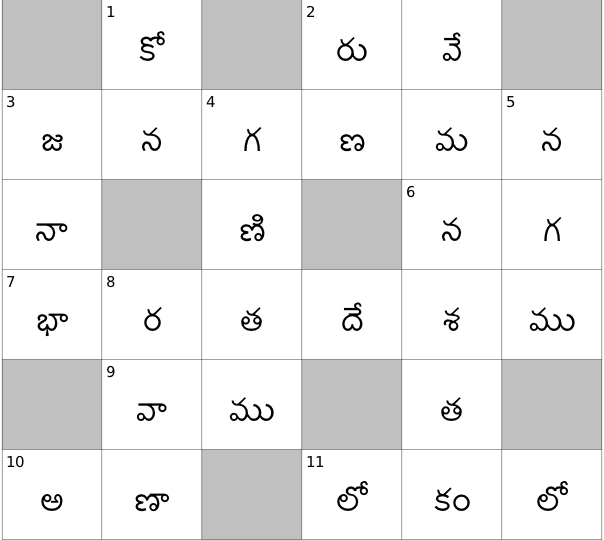 1. సెప్టెంబరు ఐదో తేదీన - జరుపుకుంటారు (6) 5. శిరస్సు (2) 6. వాడుక భాషలో రక్తపోటు (2) 8. వనం కాని వనం (3) 10. ఎర్రా ఎర్రాని పండ్లు - 'ఎ' విటమిన్ ఉండే పండ్లు (4) 13. "పోక “ చెక్కని ఇలా పిలుస్తారు(5) 15. చిగురు టాకులు 143562 (6)