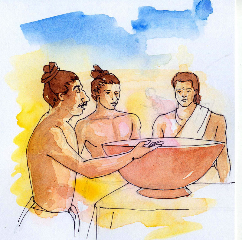 రాజు వెంటనే ఒక పాత్రలో నీళ్ళు తెప్పించాడు.