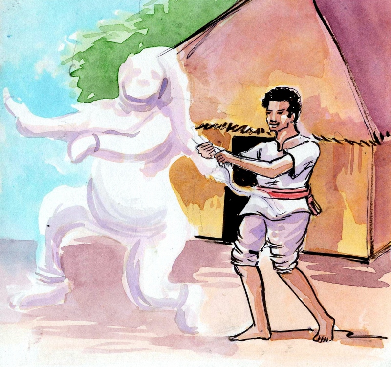 అయితే అంతలోనే రామయ్య వెళ్ళి దాని వెంట్రుకలు గట్టిగా పట్టుకున్నాడు- "కత్తిరించేస్తాను, జాగ్రత్త!" అని బెదిరించాడు.