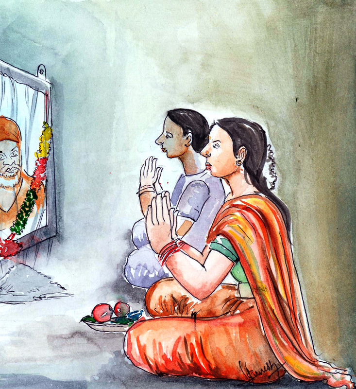 ఆమె సీసాలోని రసాయనాన్ని ఫొటో ఫ్రేముకు పట్టించింది. బాబాగారి ఫొటోని అక్కడ పెట్టి, వెళ్ళి చెయ్యి కడుక్కొని వచ్చింది.
