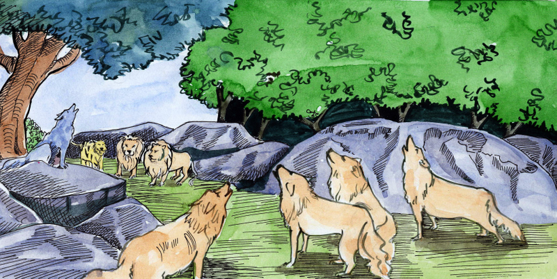 అమృత సమానాలైన ఆ మాటలు చెవిన పడగానే మిగిలిన నక్కలన్నీ పరిపూర్ణమైన ఆనందంతో గంతులు వేసాయి. అవన్నీ అప్పటికప్పుడు బయలుదేరి, సాయం సమయం అయి చంద్రుడు ఉదయించే సరికల్లా నీలి నక్క దర్బారు చేరుకున్నాయి. అటుపైన అన్నీ దానికి ఎదురుగా నిలబడి, 'ఆ రాజ్యం ఇక అంతరించిందేమో 'అన్నట్లు ఒక్కసారిగా "ఓ....." అని ఊళలు వేశాయి.