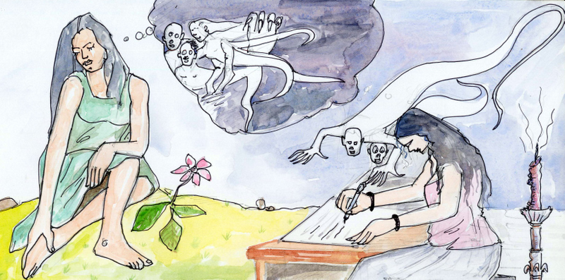 నవ్యకి, సుమకి ఇద్దరికీ దయ్యాలంటే ఆసక్తి. దయ్యాల కథలు చదవడం అంటేనూ, దయ్యాల గురించి తెలుసుకోవడం అంటేనూ వాళ్లకి చాలా ఇష్టం. అట్లా విని విని కొత్తగా కథలు రాయడం కూడా నేర్చుకున్నారు వాళ్ళు. అట్లా ఎన్ని కథలు వ్రాస్తూన్నారంటే, చివరికి వాళ్ళ చదువును కూడా పట్టించుకోలేదు వాళ్ళు. ఇంటి నిండా అట్లాంటి పుస్తకాలే పెట్టుకున్నారు ఇద్దరూనూ. వాళ్ళ అమ్మానాన్నలు వాళ్ళకు చాలా రకాలుగా చెప్పి చూశారు- "తల్లీ! ఎందుకమ్మా, ఇంత పిచ్చి? కథలే రాయాలంటే మంచి మంచి విషయాలు ఎన్ని లేవు? ఎప్పుడూ దయ్యాలేనా?" అని. అయినా గాని వాళ్ళు వింటేగా?