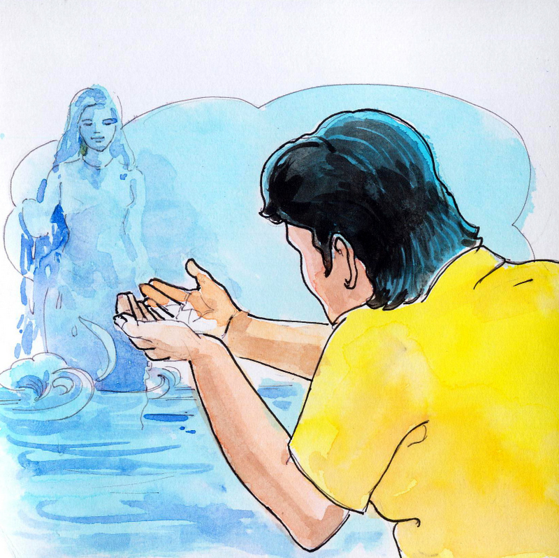 మెల్లగా చీకటి పడింది. రాజుకి కోటని చేరే మార్గం దొరకలేదు. ఆకలేస్తున్నది. "ఎటో ఒకవైపుకు వెళ్దాం, ఏదోఒక ఊరు దొరక్కపోదు" అని పోబోయాడు, కానీ ఇంకా దారి తప్పిపోయాడు. అలవాటు లేని ప్రాణం కదా, ఇంత సేపు ఏమీ తినకుండా ఉండేసరికి, ఆగలేకపోయాడు- "అవును, నేను చెరువు దగ్గర ఉన్నాను కదా, దాహం వేస్తున్నది, నీళ్లు త్రాగుతాను" అని చెరువు దగ్గరకి వెళ్ళి నీళ్లు త్రాగబోయాడు- కానీ చెరువు అతనినుండి దూరంగా వెళ్ళిపోయింది! మళ్ళీ ప్రయత్నించాడు, చెరువు మళ్ళీ దూరంగా జరిగింది! చివరికి జలదేవత ప్రత్యక్షమయింది చెరువు నీళ్ళలో- "నా నీళ్లని తాకే ధైర్యం ఎక్కడ నుండి వచ్చింది నీకు?" అని కోపంగా అన్నది- "ఈ రోజే కదా నన్ను దారిమళ్ళించావు? మరి ఇప్పుడు ఎందుకు వచ్చావు, నీళ్ళు కావాలని, నాదగ్గరికి?" ఇది అంటూ ఆవిడ చెరువుతో సహా మాయమయిపోయింది!