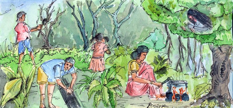 పెద్దోడు పెండ్లాంకేసి తిరిగి "నేను పోయి యాడన్నా మంచి చెట్టుందేమో చూసొస్తా... అంతలోపు నువ్వు అన్నం చేసిపెట్టు" అన్నాడు. దానికామె "ఏందీ... ఈ అడవిలో అన్నం చేసి పెట్టాల్నా.. భలే చెప్పినావులే .. నువ్వే యాడయినా పండ్లో కాయలో వుంటే చూసి తెంపుకోనిరా... ఈ పూటకు అవే తిందాం" అనింది. వాడు పెండ్లాన్ని ఏమీ అనలేక పోయి ఒక మంచి చెట్టు చూసి దాన్ని చిన్న చిన్న ముక్కలు చేసి మరలా మర్రిచెట్టు కిందకి వచ్చినాడు. వచ్చి కొడుకుతో "రేయ్...నీవు పోయి ఆ కట్టెలన్నీ తీసుకోనొచ్చి ఇక్కడ కుప్పేయి" అన్నాడు. దానికి వాడు "ఏందీ... నేను పోయి కట్టెలు తీసుకోని రావాల్నా... ఇంకేం పని లేదా నాకు. పో...పోయి నువ్వే తెచ్చుకోపో... నేను ఆడుకోవాలి" అంటూ రయ్యిమని అక్కన్నించి వెళ్లిపోయినాడు. చేసేదేమీ లేక పెద్దోడే కట్టెలన్నీ చెట్టు కిందకి మోసుకోనొచ్చినాడు.