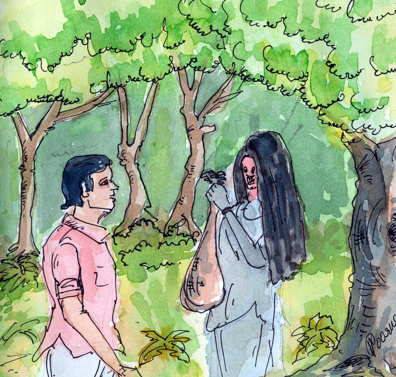చిన్నోడు కూతురికేసి తిరిగి "పాపా... ఆ కట్టెల పైనున్న నార తీసి పక్కన పెట్టు. మంచి మంచి తాళ్ళు పేనుతాను" అన్నాడు. దానికా పాప "ఎందుకు నాన్నా తాళ్ళు?" అనడిగింది. దానికి వాడు "చెట్టు మీద ఒకడున్నాడులే... వాన్ని కట్టి తీసుకుపోడానికి.... ఐనా నీకెందుకే అవన్నీ... నోర్మూసుకోని చెప్పిన పని చెయ్యక?" అన్నాడు. వెంటనే ఆ పాప వురుక్కుంటా పోయి గబగబా నార తీసి అందించసాగింది. అది చూసి దయ్యం అదిరిపడింది.