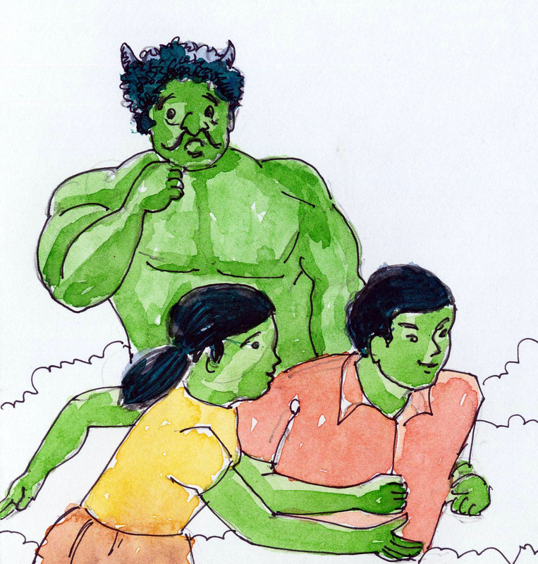 "మీరు చాలా మంచి పిల్లలు. నాకు ఇంకొక్క పొడుపుకథ వినిపించండి. ఆ తర్వాతనే మిమ్మల్ని తింటాను" అంది భూతం నవ్వుతూ. పిల్లలిద్దరూ అదిరి పడ్డట్లు చూశారు.