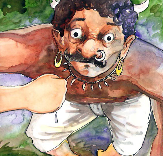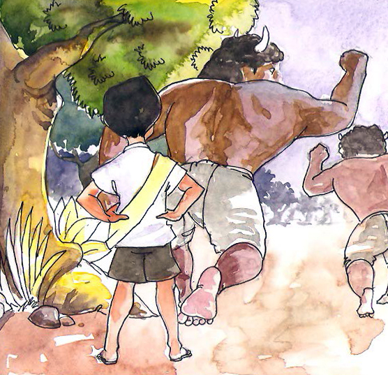 ఊరి చివర్లోనే చక్కని అడవి. రాముడు అడవిలో కొద్ది దూరం నడిచాడో లేదో, 'ఆగు' అని అరుస్తూ వాడి ముందు ప్రత్యక్షం అయ్యాడు, ఒక రాక్షసుడు. రాము ఒక క్షణం భయపడ్డాడు. కానీ అంతలోనే వాడికి తన నడుముకు ఉన్న పటకా గుర్తుకొచ్చి, చాలా ధైర్యం అనిపించింది.