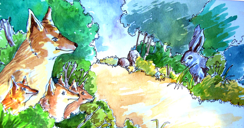 "అమ్మా నేనెళ్తానే.... నేనెళ్తానే...." అంటూ ఉత్సాహంగా అరిచింది అన్నింటిలోకీ పెద్ద దైన నక్కపిల్ల. "సరేలే, నువ్వే ముందు దూకు" అనుమతి ఇచ్చింది తల్లి నక్క . ఇంతలో కుందేలు బయటికి వచ్చింది పొదలోంచి.