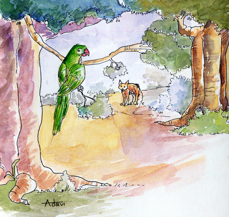 ఒక సారి టక్కరి నక్క ఒకటి అడవి దారిన పోతూ ఉంటే, ఓ చెట్టు కొమ్మ మీద కూర్చొని కనిపించిందొక చిలుక.