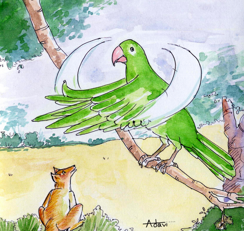 అది చిన్నగా ఆ చిలుక ఉన్న చెట్టు కిందకు చేరి- "చిలుకా! చిలుకా! నీ రెక్కలు భలే ఉన్నాయి చూపించవా!" అన్నది.