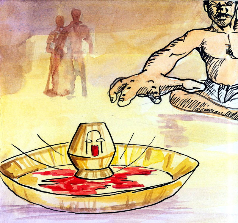 ఆలోగా ఎర్రిస్వామి చెంబులోని ఎర్ర నీళ్లను పళ్ళెంలో పోసి, ఆ పళ్ళెంలో దీపాన్ని వెలిగించాడు.