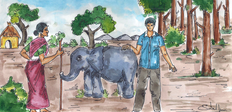 ఒకసారి అవ్వ అడవిలోంచి బరువైన కట్టెల మోపు ఒకదాన్ని ఎత్తుకొని ఇంటికి రావటం గమనించింది ఏనుగు. ఆ సమయంలో అది పొరుగింటి పిల్లలతో ఆడుకుంటున్నది. అంత బరువును మోస్తున్న అవ్వని చూస్తే దాని గుండె కలుక్కుమన్నది. తనని పెంచుతున్న అవ్వకి కృతజ్ఞతగా తనూ ఏదో ఒక పని చేయాలనిపించింది దానికి.