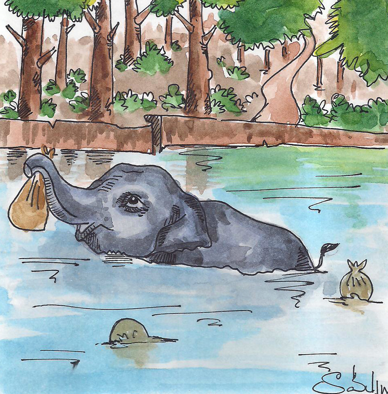ఏనుగుకు అతన్ని చూస్తే జాలి వేసింది. అది గబుక్కున నీటిలోకి దూకి, ఒక్కటొక్కటిగా అతని సామాన్లన్నిటినీ నదిలోంచి బయటికి తీసి పెట్టింది. వ్యాపారితో పాటు అక్కడున్న వాళ్ళంతా ఆశ్చర్యంగా చూస్తూ నిల్చుండిపోయారు, ఆ వింతను.