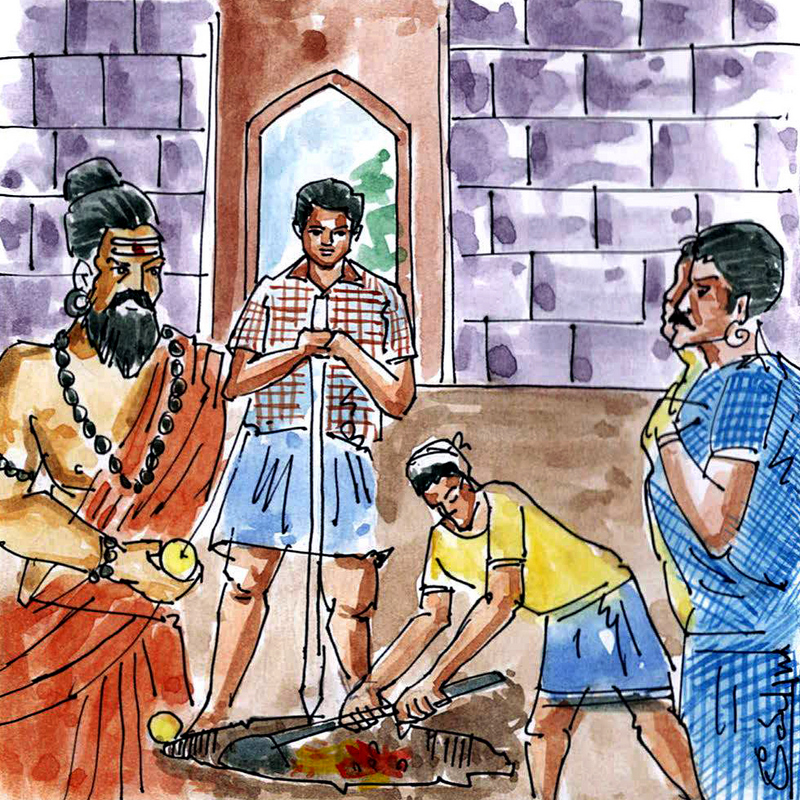 "ఆగండి! దానిని ముందుగా శేషయ్య చేతితో తీయాలి!" అన్నాడు సాధువు.
