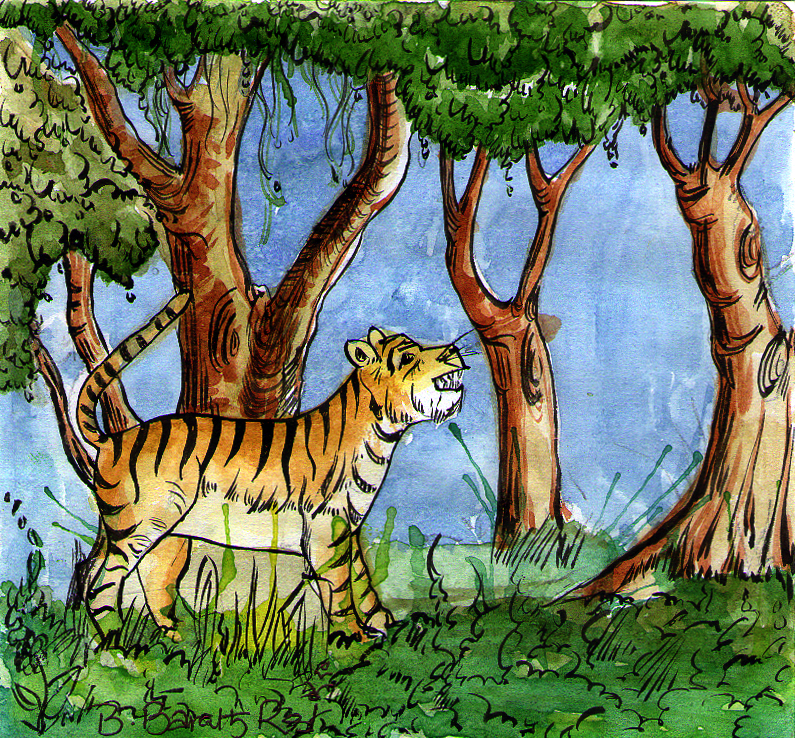 అతను ఆ మనసుతో తంటాలు పడుతుండగానే సాయంత్రం అయ్యింది. ఆ సమయంలో అతనికి 'ఎవరో తనను గమనిస్తున్నారు' అనే భావన కలిగి, రాను రాను బలపడుతూ వచ్చింది. చివరికి అతను ఇక కళ్ళు తెరిచి చూడవలసిందే అనుకొని, మెల్లగా కళ్ళు తెరచి, తల ప్రక్కకు తిప్పి, చూశాడు- ఏముంది, నిజంగానే అక్కడ ఒక పులి, తన ప్రక్కన ఉన్న ముళ్ళ పొదలో కూర్చొని ఉంది!