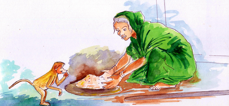 ఒక ఊళ్ళో పేద అవ్వ ఒకామె ఉండేది. ఆ అవ్వకు ఒక మనవరాలు ఉండేది. ఒక రోజున అవ్వ కూలికి వెళ్ళి వస్తూంటే దారిలో బక్కచిక్కిన కోతిపిల్ల ఒకటి కనబడింది. దాన్ని చూసి జాలి పడి, అవ్వ దాన్ని ఇంటికి తీసుకొచ్చి, ప్రేమగా పెంచి పెద్ద చేసింది.