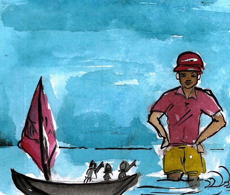 వాడికి నవ్వూ, ఏడుపూ ఒకేసారి వచ్చాయి. అంతలోనే వాడికి ఇంకో ఆలోచన వచ్చి, ఎక్కడ లేని బాధా వేసింది- 'తన పడవైతే భద్రంగానే ఉన్నది గద?!' వాడు గబగబా వెళ్ళి చూసుకుంటే, అది మటుకు ఇంకా భద్రంగానే ఉంది.