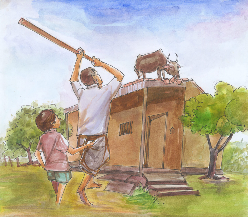 మా ఇంటి పైన ఒక ఆవు నిల్చొని పెంకులు తినేస్తోంది! అప్పుడు మా నాన్న పైప్ ద్వారా ఆవుని కిందికి తెచ్చి, ఒక మూటలో కట్టి, సంతకి తీసుకెళ్ళి అమ్మేశాడు!" చెప్పాడు చందు.