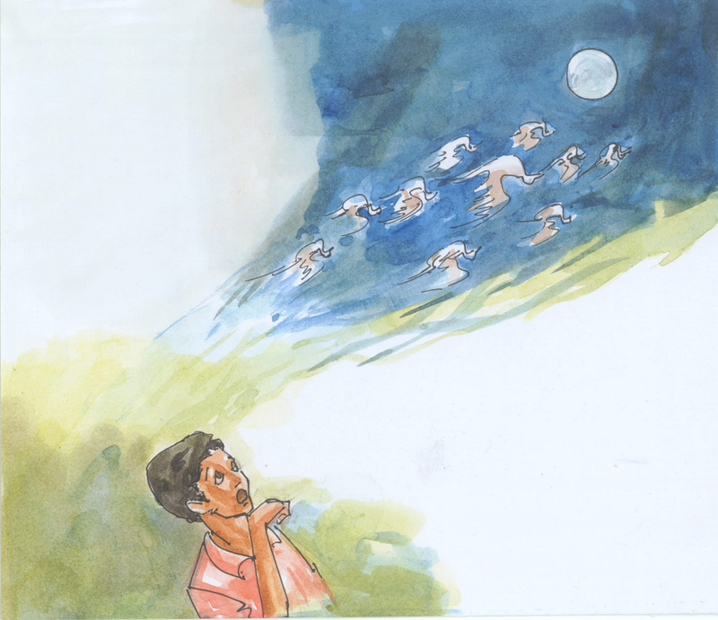 "నేను చెప్పగలను!" అని మొదలు పెట్టాడు గోపి. "ఒక రోజు నేను బడి నుండి వస్తుండగా చాలా పక్షులు -వీపు కిందికి, తల పైకి- పెట్టి ఎగురుతూ కనిపించాయి. నేను చూస్తూండగానే అవి అట్లా పైపైకి ఎగిరి ఎగిరి పోయినై. చివరికి ఆ రోజు రాత్రి చంద్రుడు వచ్చే సరికి అవన్నీ చంద్రుడిని చేరుకున్నాయి. పాపం అంత దూరం ఎగిరి వెళ్ళే సరికి వాటికి కాస్తా చాలా ఆకలి అయ్యింది. అప్పుడు చంద్రుడు వాటికి తేనె పోశాడు. ఆ తేనె కారి నా మీద పడుతుంటే నేను ఏంచేశానో తెలుసుగా, నా స్కూలు పుస్తకంతో పట్టేసుకుని కడుపునిండా తాగాను!" ఆపాడు గోపి.