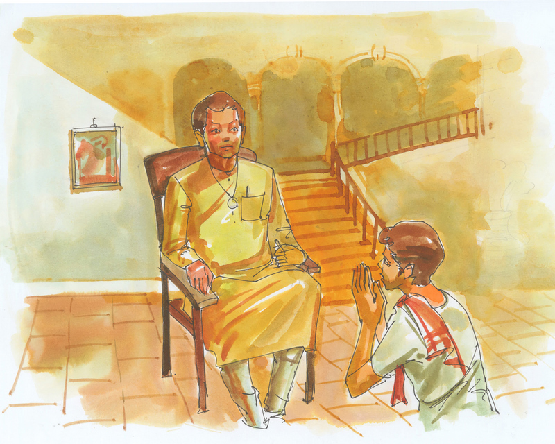 తల్లి లేచి కూర్చొని జరిగినదంతా చెప్పింది చిన్నకొడుక్కు. "నిన్ను రప్పించేందుకే ఇలా జబ్బు పడ్డట్లు నాటకం ఆడాను- నిజానికి నాకేమి, బాగున్నాను. ఎలాగో ఒకలాగా మీ అన్నను మార్చు. అలాగే ఆ పేదవాడిని విడిపించు నాయనా" అని ప్రాధేయపడిందావిడ.