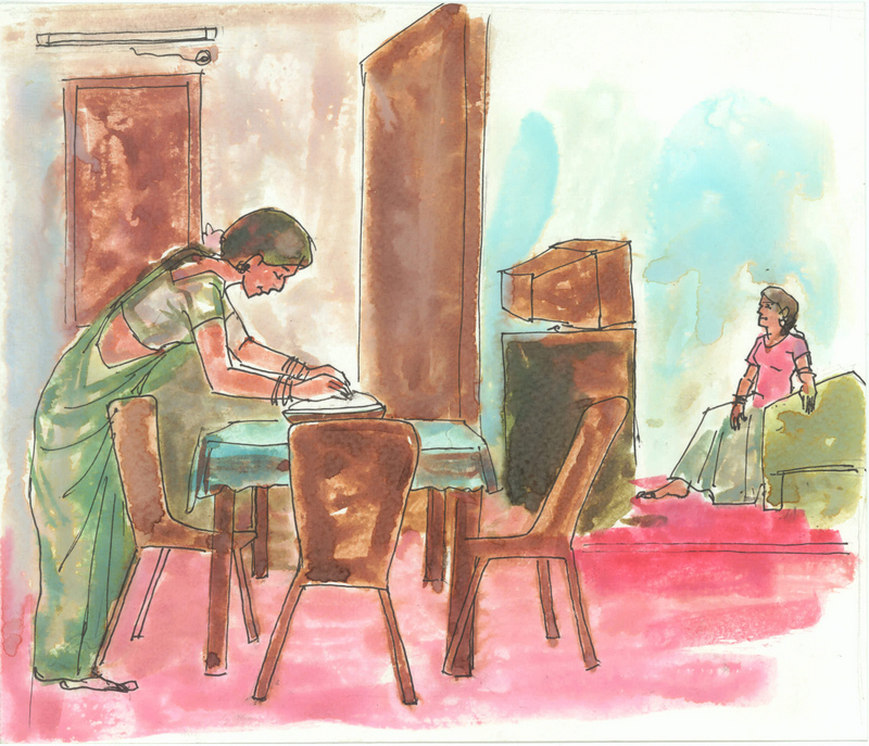 “అమ్మ లేదులే, నేనే ఇస్తా ఉండు!" అని బీరువాలోనుండి డబ్బులు తీసి ఇచ్చా.