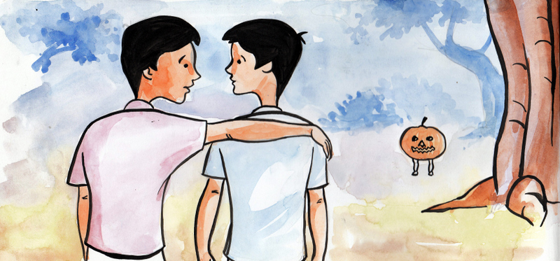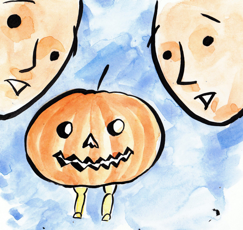 అనగనగా ఒక ఊళ్ళో రంగయ్య, పుల్లయ్య అని ఇద్దరు స్నేహితులు ఉండేవాళ్ళు. వాళ్ళు ఒకరోజున ఆడుకోటానికి వెళ్తూ ఉంటే దారిలో వాళ్లకొక వింత గుమ్మడి కాయ కనిపించింది: దానికి కళ్ళు, ముక్కు, చెవులు, నోరు ఉన్నాయి! వాళ్లలో రంగయ్యకు భయం ఎక్కువ. పుల్లయ్య మటుకు ధైర్యవంతుడు. పుల్లయ్య గబుక్కున ముందుకు వంగి ఆ గుమ్మడికాయను ముట్టుకోబోయాడు.