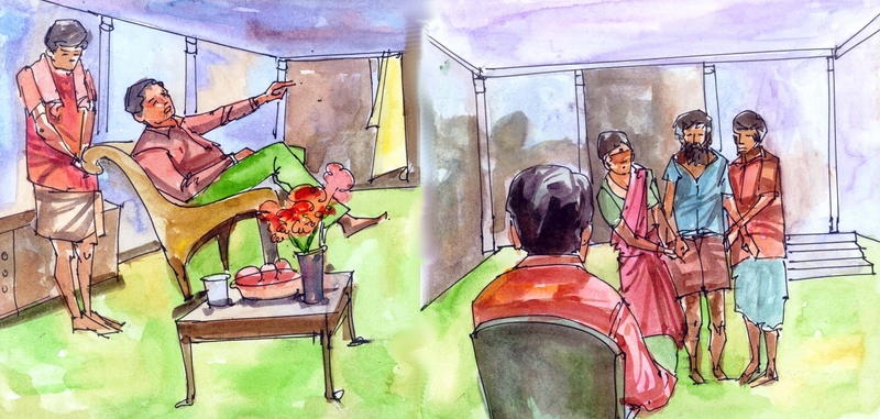 అయితే సోమదత్తుడి స్థితి మరోలాగా ఉన్నది. 'తను భిక్షగాడు' అని తప్ప మరేదీ తెలీదు వాడికి. ధనదత్తుడిని, అతని సేవకులని చూస్తేనే వాడికి వణుకు పుట్టుతున్నది. ధనదత్తుడి మహలులో వాడు కనీసం లేచి కూడా నిలబడలేకపోయాడు.