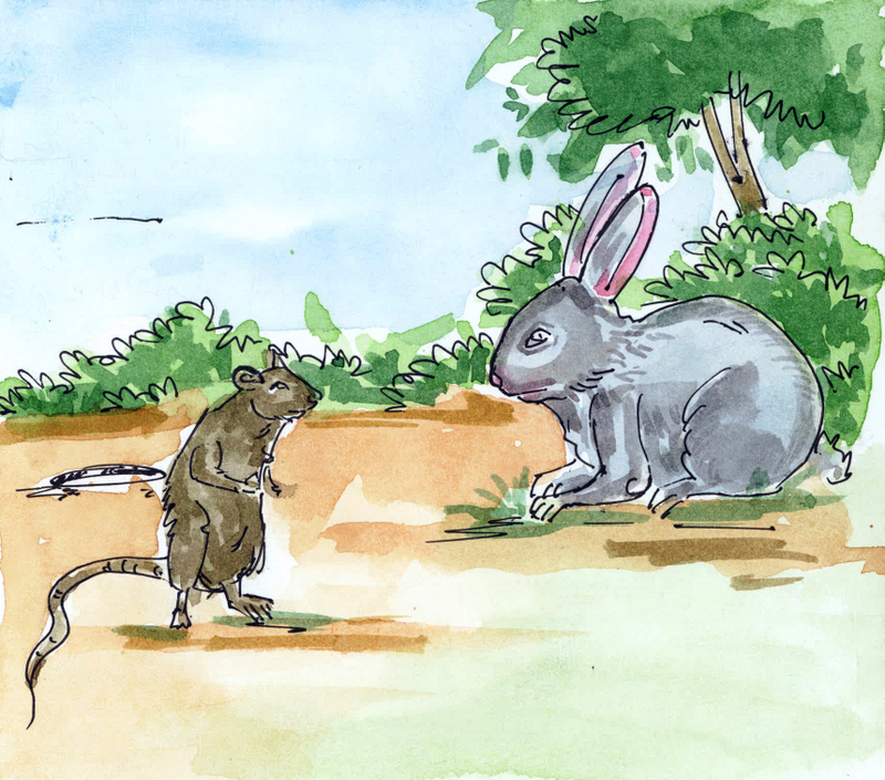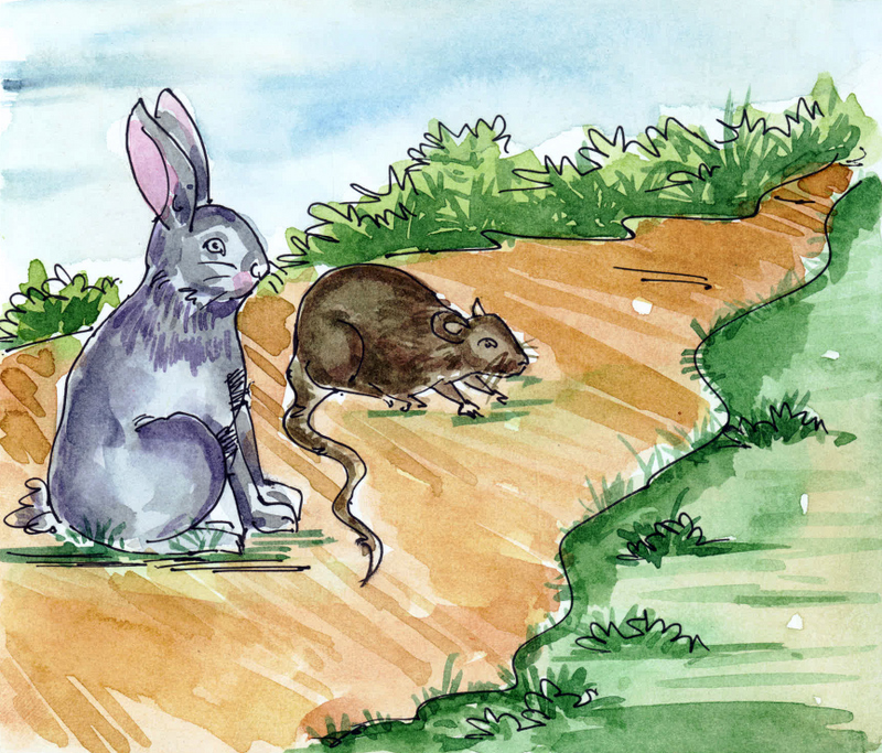 అనగా అనగా ఒక అడవిలోఒక కుందేలు, ఒక ఎలుక ఉండేవి. అవి రెండూ చాలా మంచి స్నేహితులు. కుందేలు ఒక చిట్టి పొదలో ఉండేది; ఎలుక ఆ పొద క్రిందుగానే ఓ బొరియలో నివసించేది.