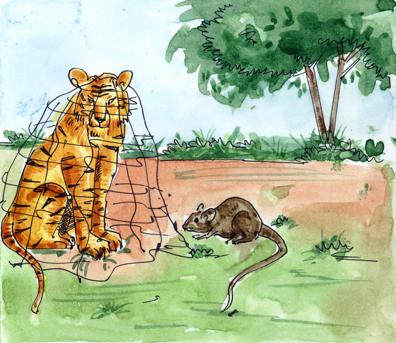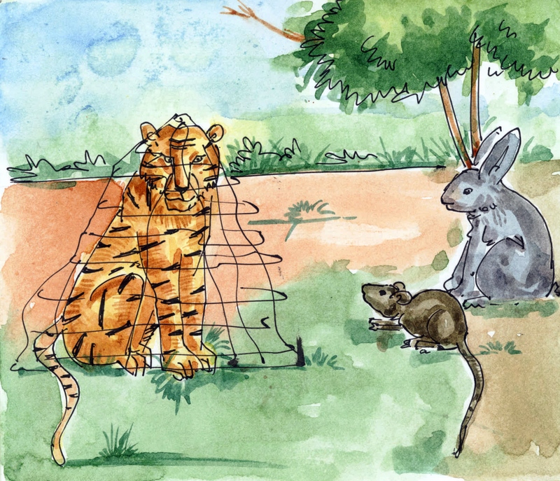 కుందేలు, ఎలుక దాన్ని చూసి "అయ్యో పాపం" అనుకున్నాయి. ఇంతకీ పులిని పట్టుకొని పోయి ఏంచేస్తాడు ఈ వేటగాడు?" అడిగింది ఎలుక, కుందేలును.