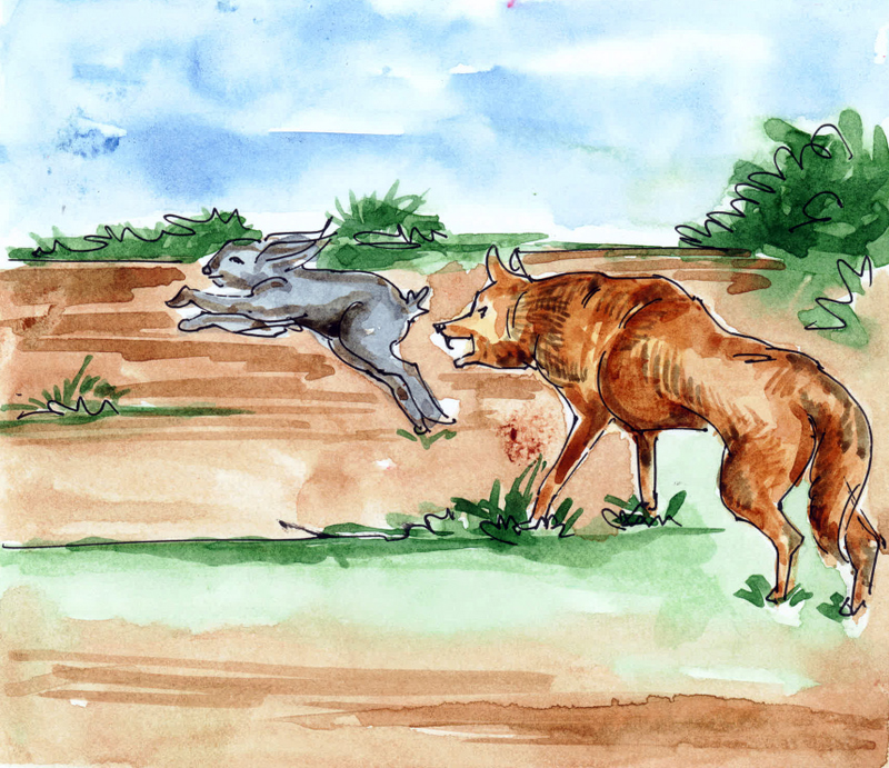 "నేనేమీ అనను. నన్ను విడిపించు ప్లీజ్! నాకు సర్కసులో పనిచేయాలని అస్సలు లేదు!" అన్నది పులి, వలలోనే గింజుకుంటూ. అంతలోనే ఒక నక్క పొదచాటు నుండి ఎలా వచ్చిందో వచ్చింది. తటాలున కుందేలు మీదికి దూకింది. కుందేలు భయంతో గజగజా వణుకుతూ పొద చుట్టూ పరుగెత్తటం మొదలు పెట్టింది. నక్క దాని వెంట పడింది "ఆగవే, నానుండి ఎలా తప్పించుకుంటావో చూస్తాను..ఎక్కడికెళ్ళినా నానుండి తప్పించుకోలేవు" అంటూ.