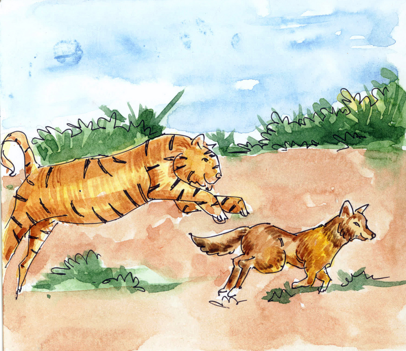 మరుక్షణం ఎలుక బొరియలోకి దూరింది; కుందేలు పొదలోకి పారిపోయింది; పోబోయిన ప్రాణాలు దక్కాయన్న సంతోషంతో పులి తన గుహకేసి పరుగు పెట్టింది!