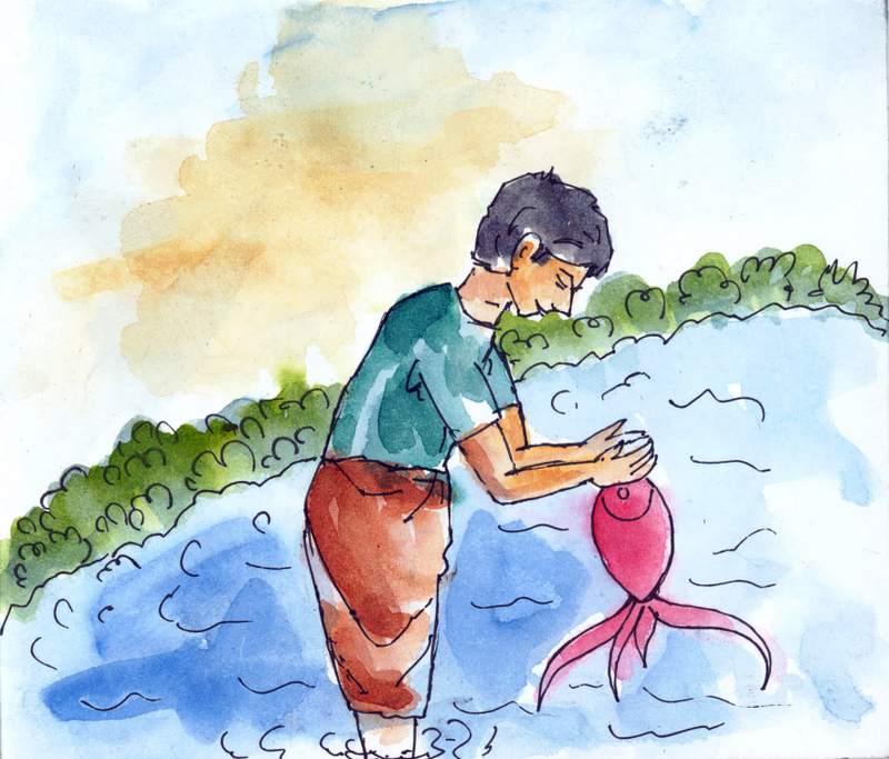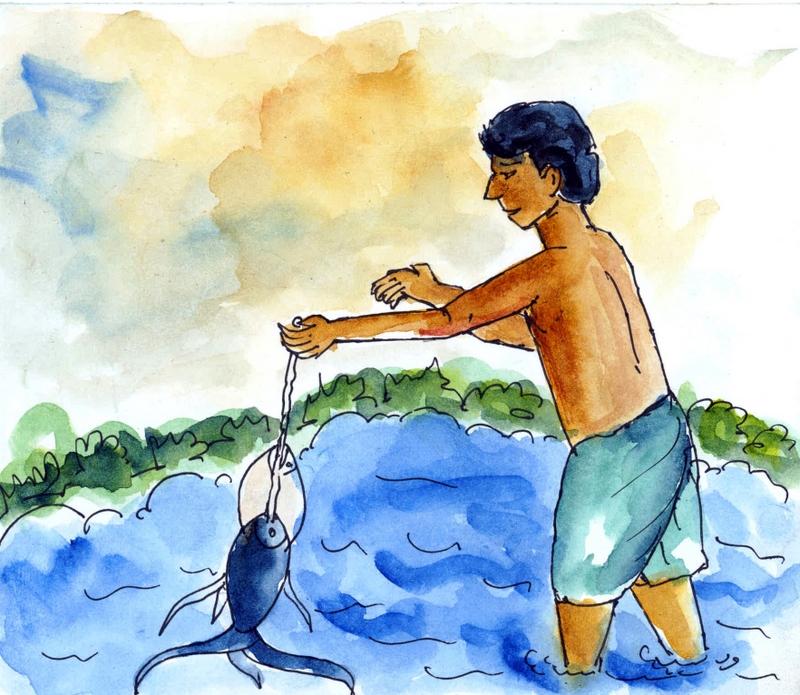 ఆ తర్వాత కొన్నాళ్లు గడిచేసరికి , ఎండలు బాగా పెరిగాయి. పూట పూటకూ చెరువులో నీళ్లు మరింత తక్కువ అవ్వసాగాయి. అది గమనించిన జాలర్లు - వలలు, గాలాలు, ముళ్ల కర్రలు, ఊతాలు, బుట్టలు లాంటి సరంజామాతో వచ్చి దిగబడి, నీళ్లలోకి దిగి, నీటిలోగల చేపలన్నింటినీ పట్టుకుని ఒక్కొక్కదాన్నీ తాళ్ళకు గుచ్చడం మొదలుపెట్టారు.