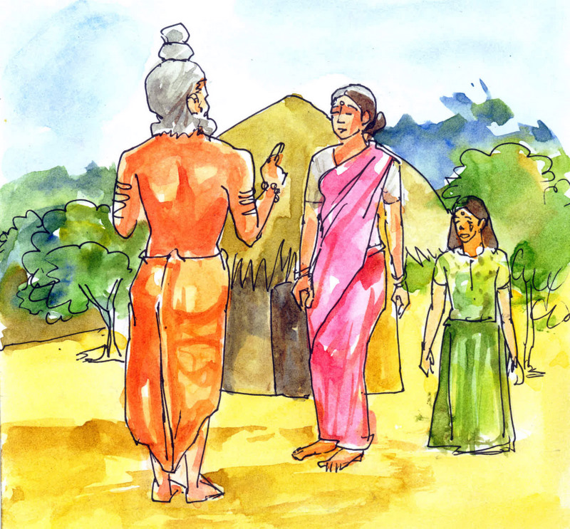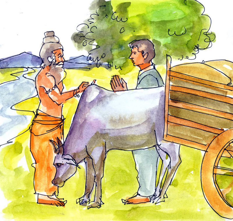 స్వామీజీని చూసిన రైతు భార్య కంగారు పడింది- "ఏందయ్యా స్వామీజీతో బండి నెట్టించావు. మనకు పాపం చుట్టుకుంటుంది!" అంది భయంగా.
