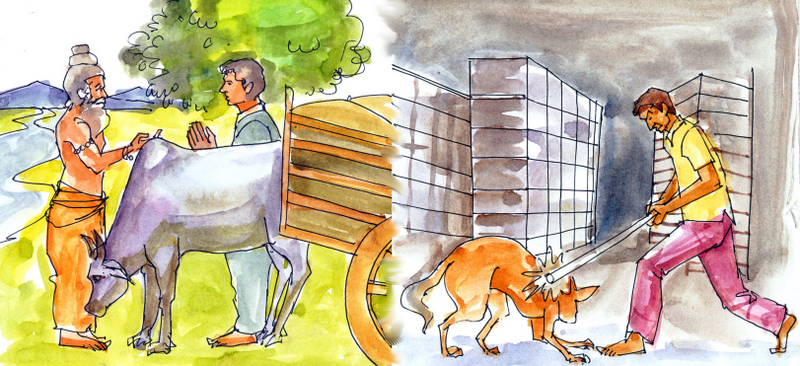 "బండిపైన అన్ని బస్తాలు బరువు పెడితే, పాపం ఆ జీవి ఎలా లాగగలదు? కొంచెం బరువు తగ్గించాల్సింది!" అన్నారు ఆయన, ఎద్దువైపు జాలిగా చూస్తూ.