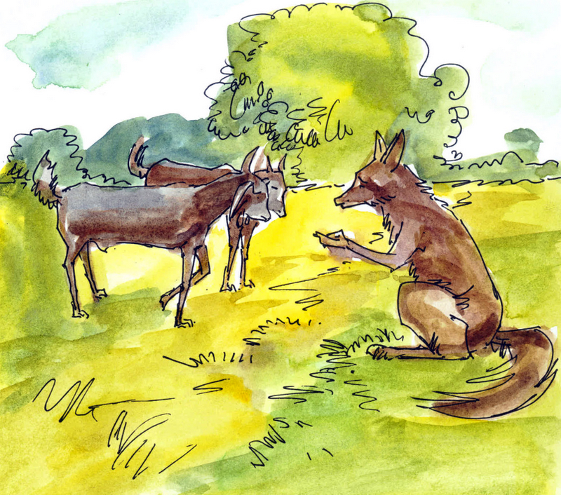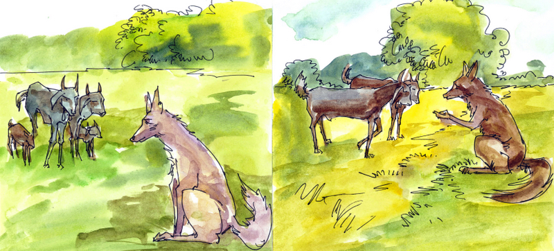 "నేను నీ స్నేహితుడిని ఎందుకవుతాను? నేను తోడేలును, నీది మేక జాతి. నీకూ నాకూ ఎట్లా పొసగుతుంది?! నేను ఊరికే అట్లా నటించానంతే!" అన్నది తోడేలు, కోరలు చాపుతూ.