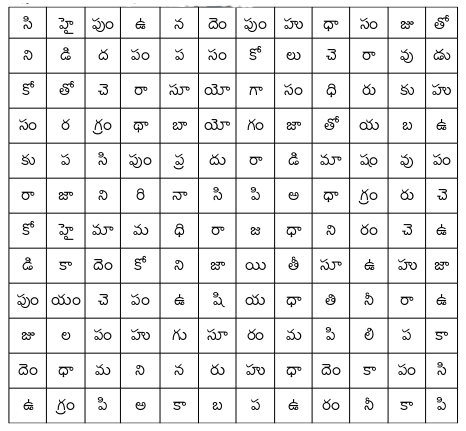 పై పదాలు ఈ క్రింది పట్టికలో దాగున్నాయి- నిలువుగా, అడ్డంగా, వాలుగా, క్రిందినుండి పైకి- ఎటుపడితే అటు! వాటిని వెతికి పట్టుకోండి. వాటి చుట్టూ గుండ్రాలు గీయండి!