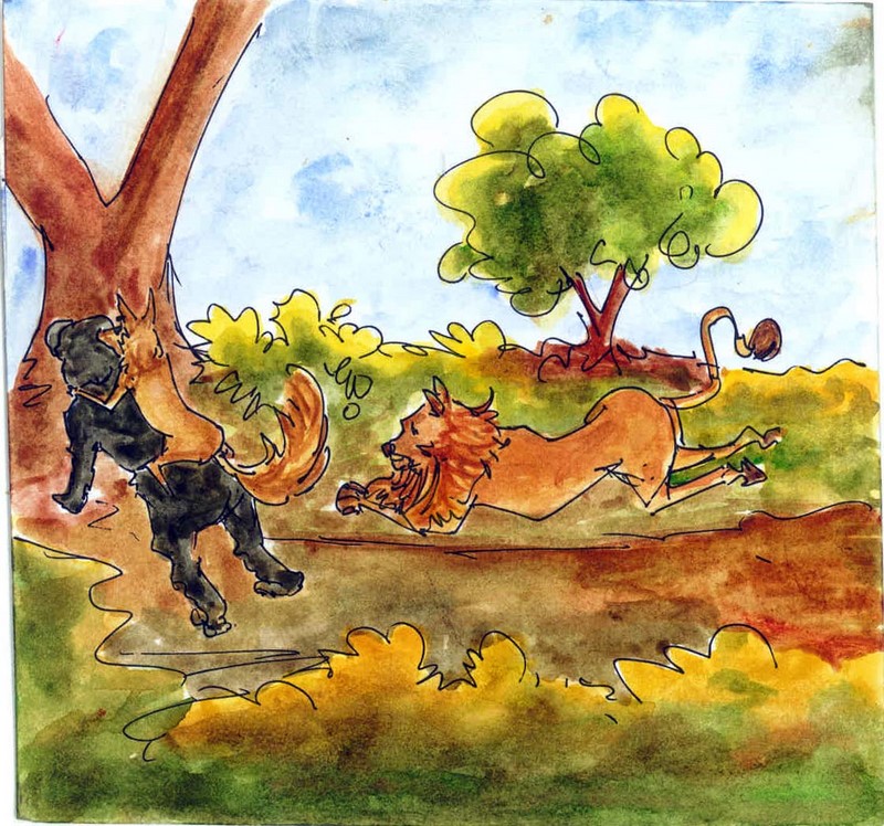 చెట్టుపైన కొమ్మల్లో ఎలుగుబంటి-నక్క కదలక మెదలక ఉండగా చెట్టుకింద సింహం వాటివైపే చూస్తూ కూర్చున్నది. ఎలుగు-నక్క చెట్టు దిగలేదు. సింహం ఎంతకీ పక్కకు కదలలేదు.