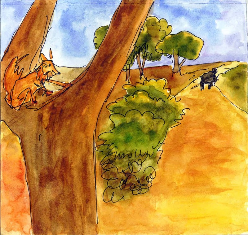 ఆ సరికే భయంతో వణుకుతున్న నక్క ఎలుగుబంటి మాటలు వినగానే తటాలున దాని వీపును కరచుకున్నది. ఎలుగుబంటి చకచకా చెట్టు ఎక్కేసింది!