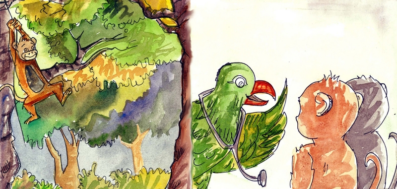 కోతి భార్య కోతిని బాగా తిట్టి డాక్టర్ చిలుక దగ్గరకి తీసుకెళ్ళింది.