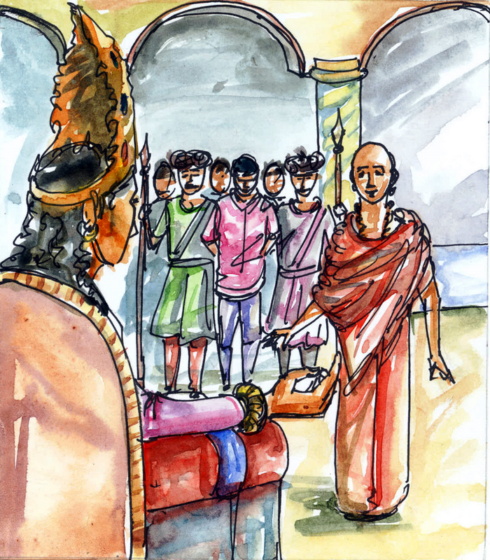 న్యాయాధికారిగారు వాంజ్ఞ్మూలం ఇచ్చేం-దుకుగాను షిచిరీని పిలిపించారు. "ఈ మనిషి మీ ఇంటి నుండి డబ్బు దొంగిలించాడట కదా?! జాగ్రత్తగా చూడండి ఇతన్ని. ఇతనేగా, దొంగ? జాగ్రత్తగా చూసి చెప్పండి" అన్నారు.