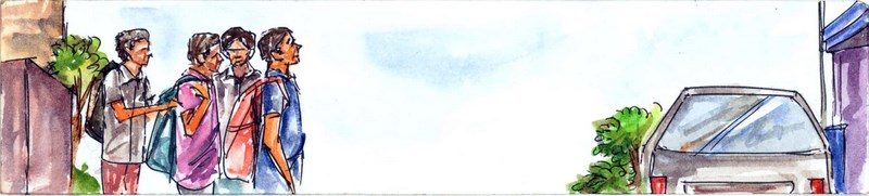 పవన్, వాడి స్నేహితులు ముగ్గురు- రోహిత్, సునీల్, రవి- నలుగురూ బస్టాపులో నిలబడి ఉన్నారు. అందరూ బస్సు కోసం ఎదురు చూస్తున్నారు: