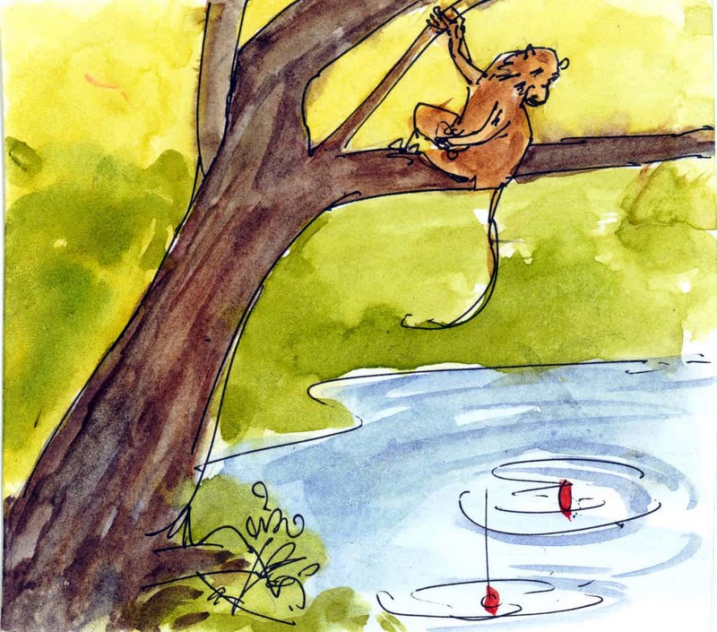 అలా పళ్ళమీది ఆశ కొద్దీ అది కోతితో స్నేహం చేసి, ఇల్లూ-వాకిలీ మర్చిపోయి, భార్యాబిడ్డలను వదిలేసి, నెలల కొలదీ అక్కడే కాలక్షేపం చేయటం మెదలు పెట్టింది.