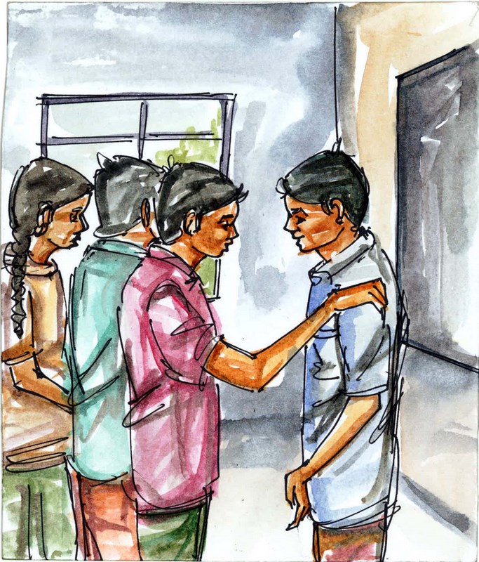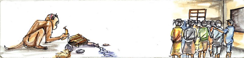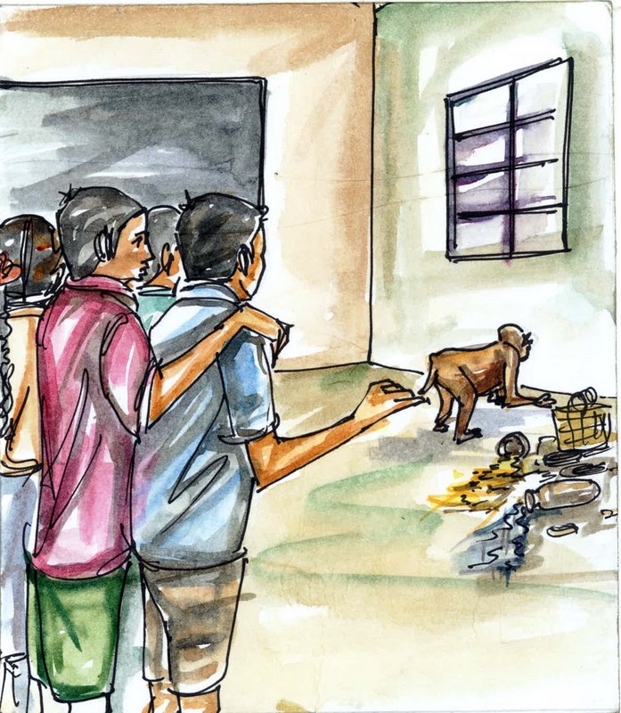 మిగిలిన పిల్లలంతా వాడికేసి చూసి, తర్వాత కోతి కేసి చూశారు. హాల్లో ఉన్న అయ్యవారు ఆ పిల్లాడి దగ్గరికి పరుగెత్తారు. నేను మటుకు కోతినే గమనిస్తున్నాను.. దాని ముఖం చూస్తే నవ్వొస్తోంది నాకు. అయితే హాల్లో ఇంక గందరగోళం మొదలైంది: పిల్లలంతా దాన్నే చూస్తూ దడపడిపోతున్నారు!