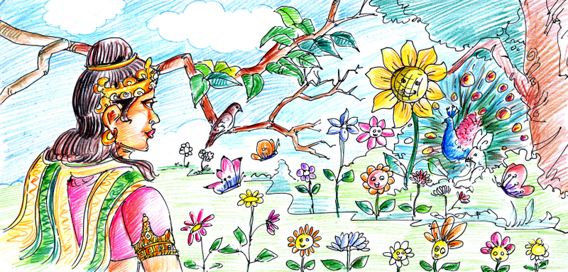 రాణి సౌభాగ్యలక్ష్మీదేవికి తోటలంటే ప్రాణం. అంత:పురం వెనకాల పెద్ద ఉద్యానవనం ఒకటి వేయించారావిడ. తోటనిండా పసుపు బంతులు, చేమంతులు, తెల్లని లిల్లీలు, నందివర్ధనాలు, ఎర్ర గులాబీలు, మందారాలు, సువాసనలు విరజిమ్మే మల్లెలు, విరజాజులు, మాలతీలు. ఇవేకాక కనకాంబరాలు, ప్రొద్దుతిరుగుళ్లు, కలువలు, తామరలు- ఇంకా ఎన్నో.