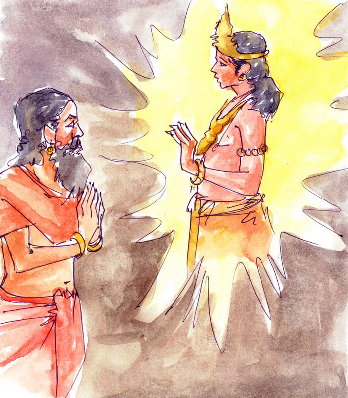 పట్టుదల కొద్దీ బయలుదేరనైతే బయలుదేరాడుగానీ, ఐదేళ్ళ పిల్లాడికి తపస్సు గురించి ఏం తెలుస్తుంది పాపం? దారిలో వాడికి నారదమహర్షి ఎదురయ్యాడు. "ఇంత చిన్న పిల్లవాడివి, అడవి దారిన ఎందుకు వెళుతున్నావు నాయనా?!" అని అడిగాడు. నారదుడు చాలా మహత్తులున్న దేవఋషి.