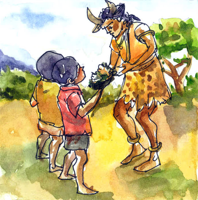 "అవును మామా! ఇతను మంచివాడే- తన పేరు 'హు హు'- వింధ్యపర్వతాల నడుమన ఉన్న అడవిలో వీళ్ళ జాతివాళ్ళు ఏ కొద్దిమందో మాత్రం ఉన్నారట. రాక్షసుల్లాగా పెద్ద పెద్ద శరీరాలుంటాయి వీళ్లకి- అయినా వీళ్లు మాంసం తినరు- మనలాంటి మనుషులే కద, వీళ్ళూనూ!