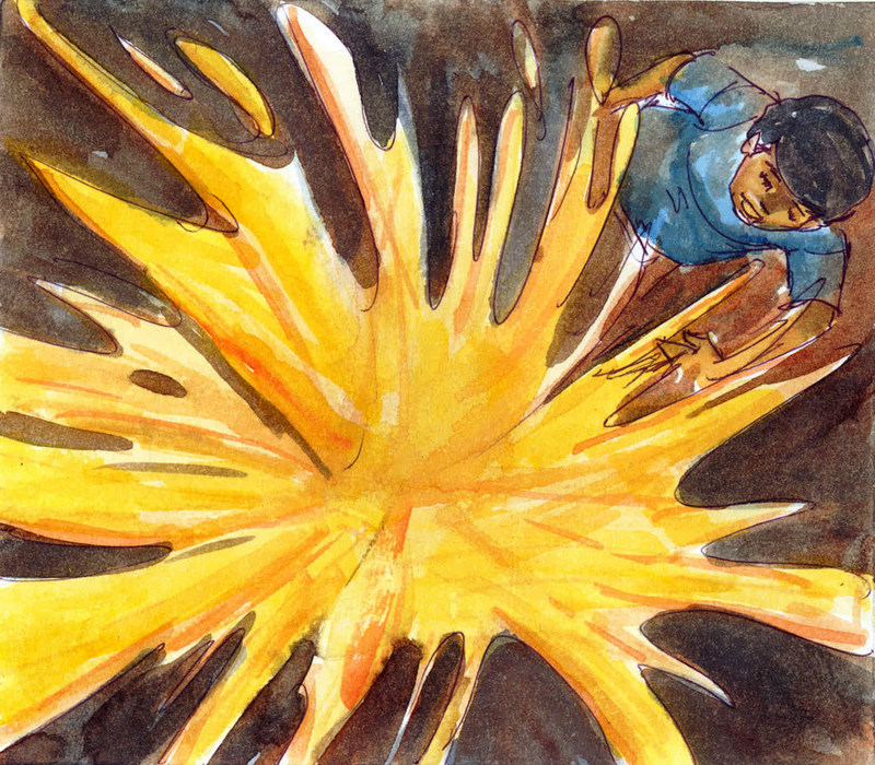 ఇంకేముంది? ఆ రాకెట్టు పేలింది! అక్కడున్న రసాయనాలన్నీ అంటుకున్నై. ఎక్కడెక్కడో ఉన్న సైరన్లన్నీ మోగినై. పోలీసులు, అగ్నిమాపక దళం వాళ్ళూ అందరూ పరుగు పరుగున వచ్చేసి, నేలమీద పడి వణుకుతున్న నన్నూ, మా అన్ననూ ఇద్దర్నీ తీసుకెళ్ళి ఆసుపత్రిలో చేర్చారు.