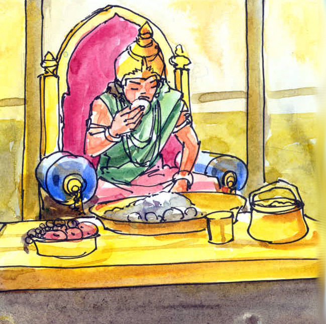 రాజుగారు మళ్ళీ బాధగా కూర్చున్నారు. తన చేతితో ఒక బంగారు కుండను తాకారు. తక్షణం అది కాస్తా మాయమయిపోయింది!
