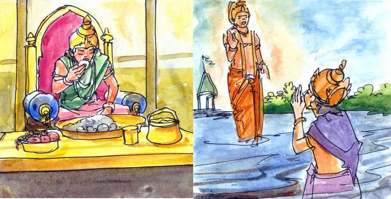 రాజు అప్పుడు ఇంక రాజ్యంలోకి వెళ్ళాడు. అంతలో రాజుగారి ప్రాణ స్నేహితుడు ఒకతను వచ్చాడు. అతని పేరు శివయ్య. రాజుగారు అతన్ని ఆప్యాయంగా కౌగిలించుకున్నారు. అంతే- రాజుగారి స్నేహితుడు కాస్తా మాయం అయిపోయాడు! రాజుగారు చాలా బాధపడ్డారు. ఆయన అట్లా బాధగా కూర్చొని ఉండగా ఆయన సైనికుడు ఒకడు వచ్చి కొన్ని లడ్డూలు ఇచ్చి తినమన్నాడు. రాజుగారికి వాటిని చూడగానే నోరు ఊరింది. అయితే ఆయన లడ్డూలను తాకాడో లేదో- అవి మాయమయ్యాయి!