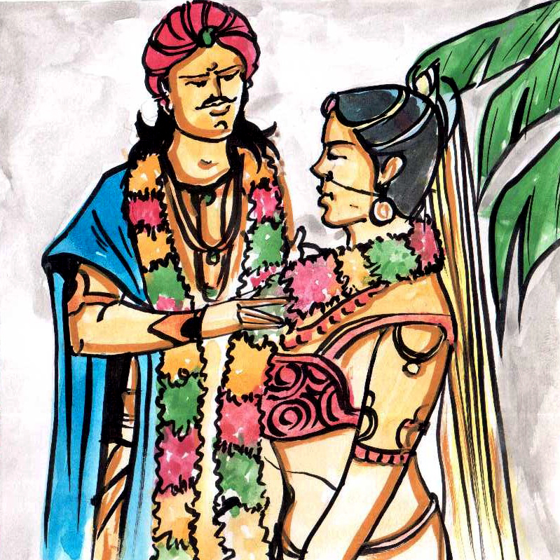 మాళవ రాకుమారి మెల్లగా నడుచుకుంటూ వచ్చింది. మొదట తెర వైపు చూసింది. రాకుమారుడు తెర వెనుక నిలబడి చూస్తున్నట్లుగా అనుమానం వచ్చిందా-మెకు. ఒక్కసారిగా ఆమెను సిగ్గు కమ్మేసింది. అలా అలవోకగా అద్దంలోకి చూస్తూ సిగ్గుతో చిరునవ్వు నవ్విందామె. నవ్వుతూ కనపడిన ఆమె ముఖం అద్దంలో కనబడగానే సమీరవర్మ తెర చాటు నుండి వెలుపలకి వచ్చాడు- మంత్రులు తెచ్చిఉంచిన పూలదండను మెడలో వేసి, ఆమెను తన భార్యగా స్వీకరించాడు.